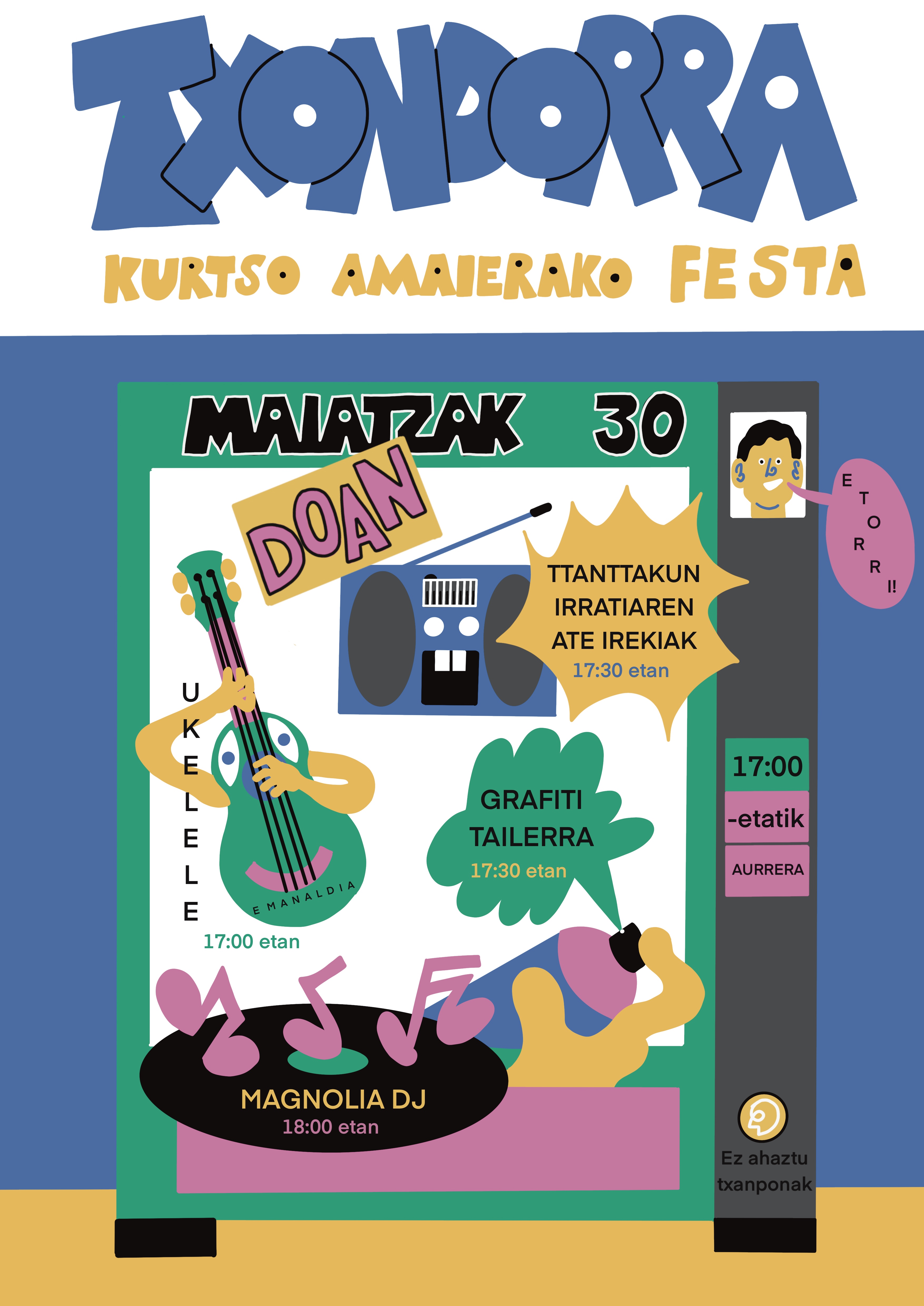 Ostirala maiatzak 30ean Txondorrako kurtso amaiera festa ospatuko da, eta Ttan Ttakun irratiak Ate Irekien eguna izango du 17:00tatik aurrera, edonork gure instalazioak ikusi eta ezagutzeko aukerarekin. Noski, nahi duenak irratsaio bat egin dezake Ttan Ttakun irrati euskaldun librean.