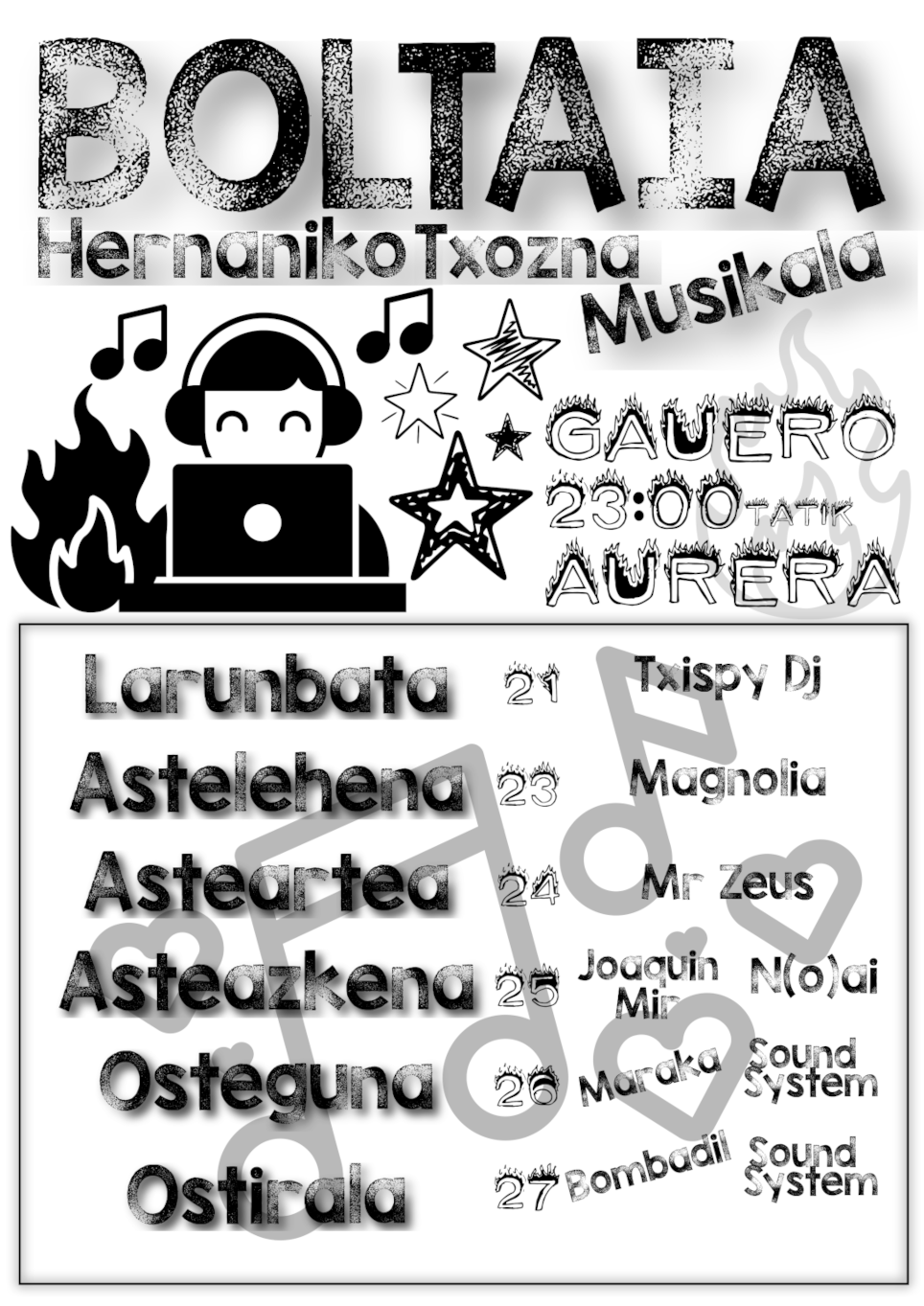 Hernaniko jaiak ospatuko dira ekainak 21, 23, 24, 25, 26 eta 27an eta Boltaia Txozna musikalean egitarau oparoa prestatu dugu, gauero musikarekin girotuz gunea 23:00tatik aurrera.